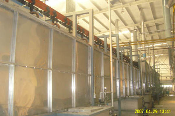 9、懸掛輸送機的保護裝置------工件吊掛方式采用氣封式結構設計,懸鏈在室體頂口外部運行,采用風機將外溢的熱氣沿前處理頂部開口抽出室外,徹底地防止酸氣、蒸汽等腐蝕懸鏈。