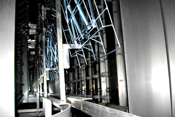 前處理設備根據(jù)工件形狀和生產(chǎn)量不同,主要結構形式有浸漬式、隧道通過噴淋式: